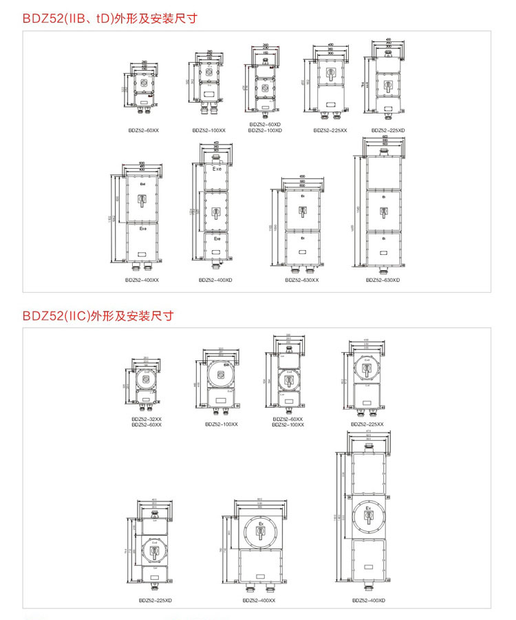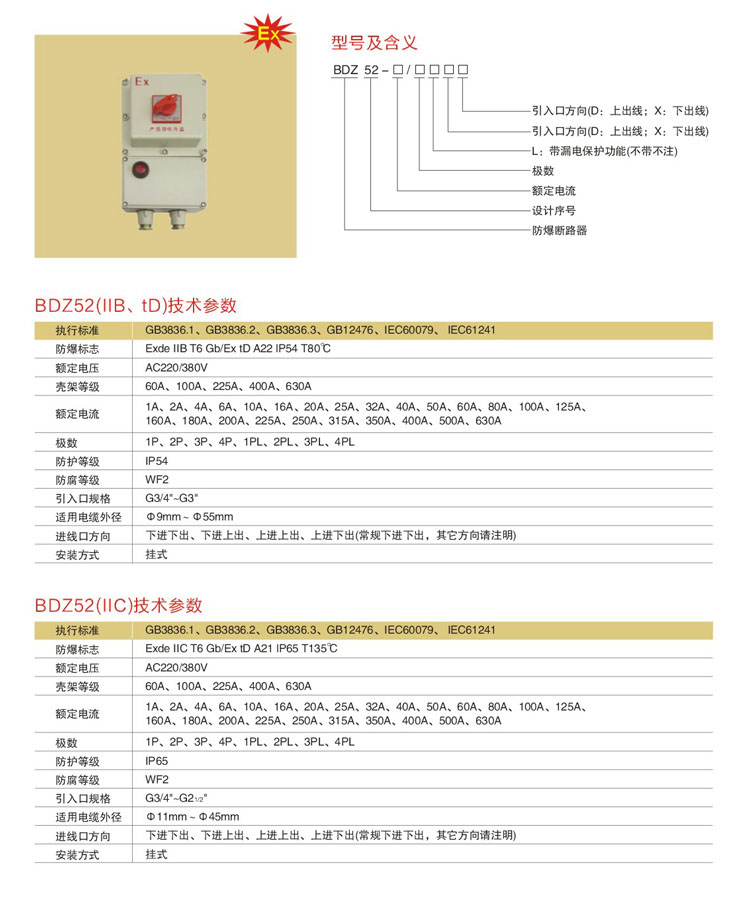 例:若需訂購BDZ52防爆斷路器,額定電流為32A、4極、下進下出,則訂貨型號為“BDZ-32/4