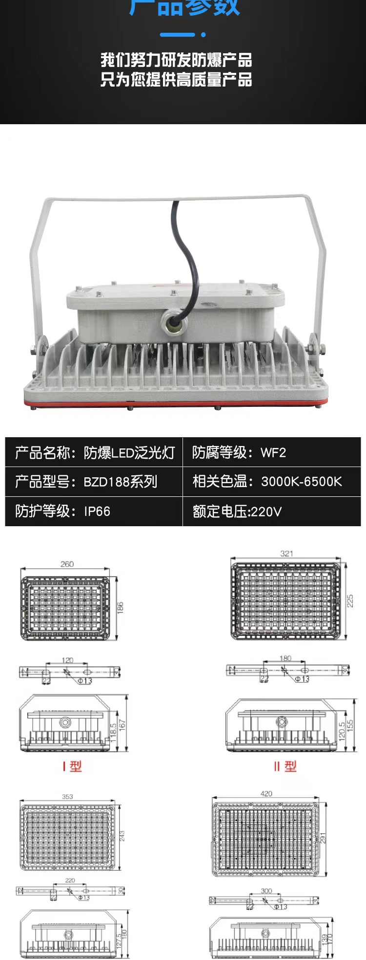 ◇防爆燈外殼采用鋁合金高壓鑄造成型,表面經拋丸后高壓靜電噴塑,有效提高了殼體的散熱性能;