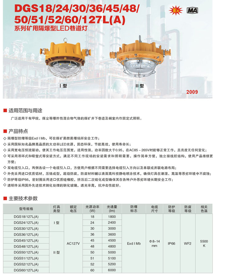 廣泛適用于有甲烷、煤塵等爆炸性混合物氣體的煤礦井下巷道及室內作固定式照明。