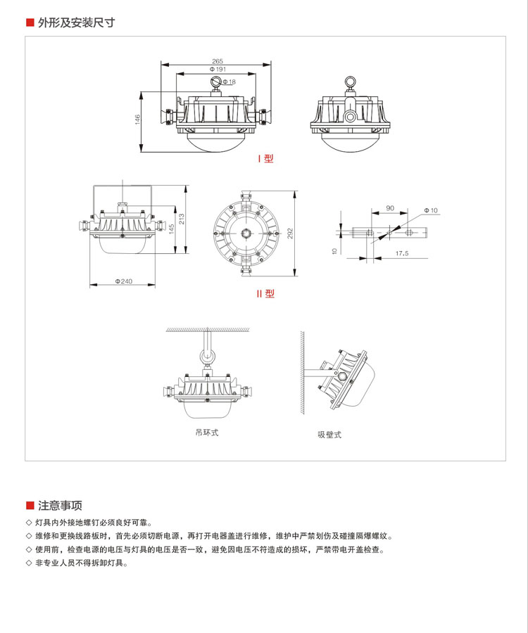 ◇可采用吊環(huán)式和吸壁式等安裝方式,滿足不同工作現(xiàn)場的安裝需求和照明需要,操作簡單方便,獨立接線腔結構,使用產品維修更方便;