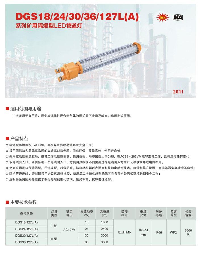廣泛適用于有甲烷、煤塵等爆炸性混合物氣體的煤礦井下巷道及室內(nèi)作固定式照明.