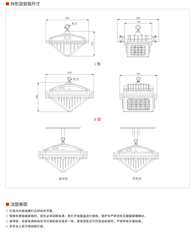 ◇可采用吊環(huán)式和吸壁式等安裝方式,滿足不同工作現(xiàn)場的安裝需求和照明需要,操作簡單方便,獨(dú)立接線腔結(jié)構(gòu),使用產(chǎn)品維修更方便;