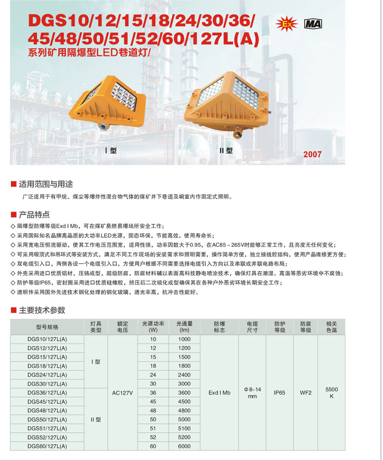 廣泛適用于有甲烷、煤塵等爆炸性混合物氣體的煤礦井下巷道及室內(nèi)作固定式照明.